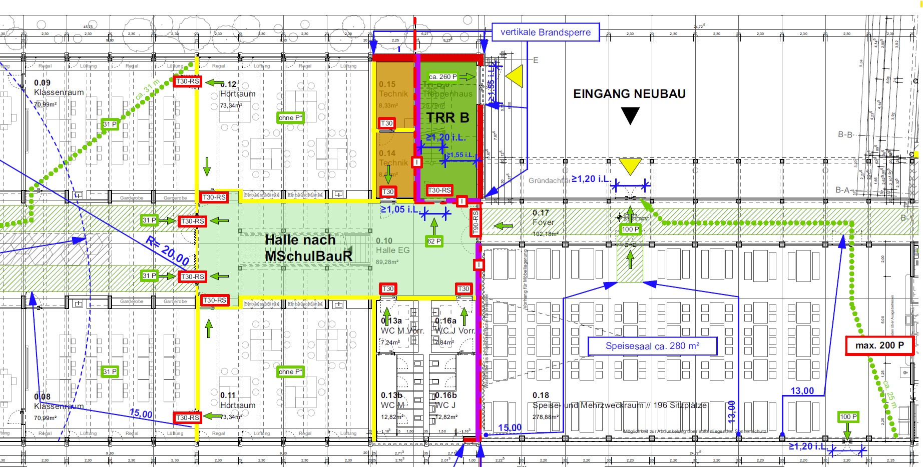 Die Maßnahme erweitert die Schule um dringend benötigte Kapazitäten und zeitgemäße Raumstrukturen. Gleichzeitig mussten bestehende brandschutztechnische Defizite im Altbau gelöst werden. Ziel war ein Schulkomplex, der offene Lernformen unterstützt, kurze Wege schafft und trotz großer zusammenhängender Flächen ein hohes Sicherheitsniveau gewährleistet. Die vom Auftraggeber aus gestalterischen und ökologisch-nachhaltigen Gründen gewählte Holzbauweise sowie die erforderliche Barrierefreiheit stellten besondere Anforderungen an die Brandschutzplanung.